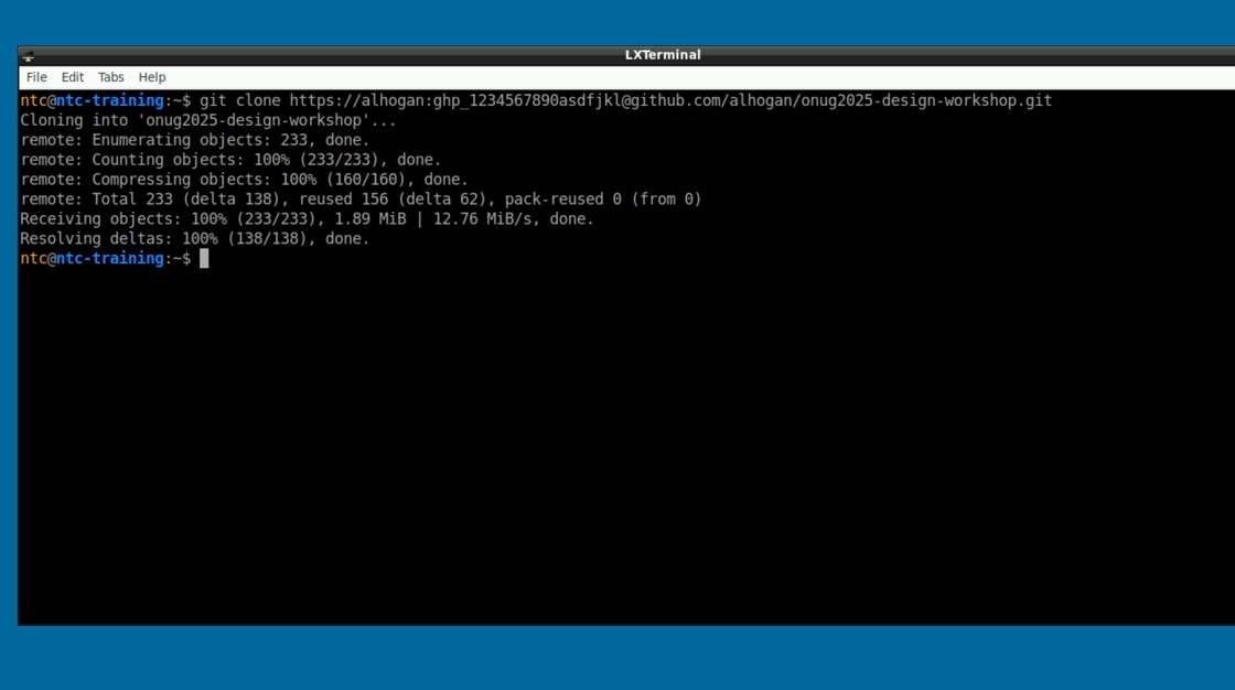 5. Hit enter to clone the repo to the current folder (the Home folder for the ntc user)
