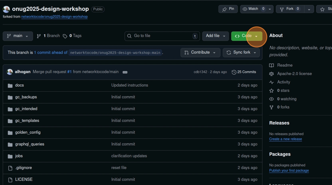 1. While on the forked repo (ie under your account), click “Code”