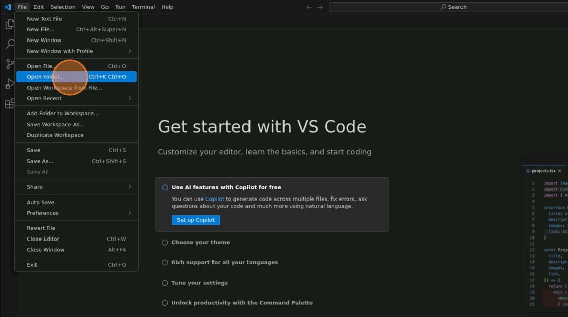 6. Close the terminal window and Open VSCode. Click “File -> Open Folder”