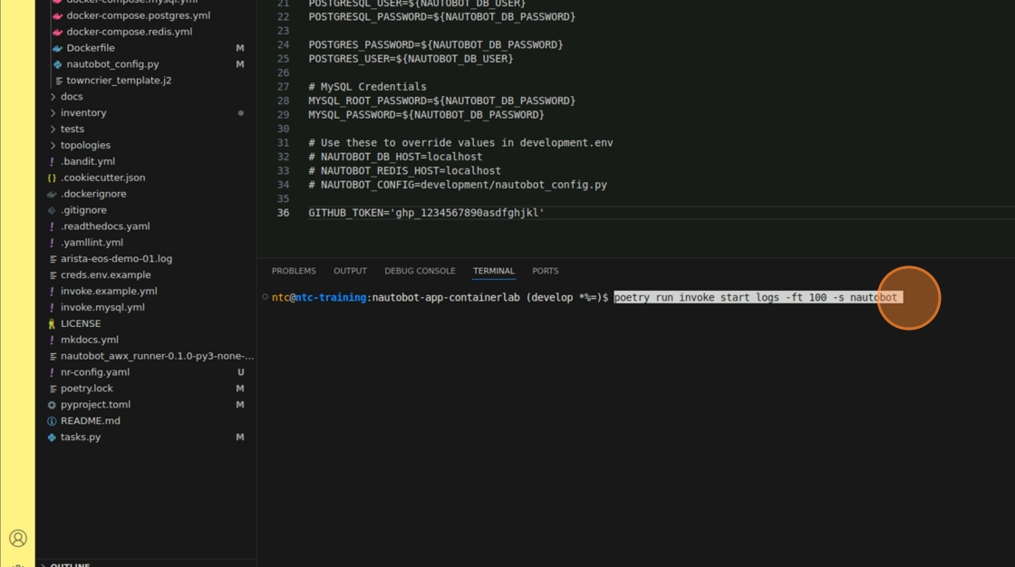 10. In the new terminal, type “poetry run invoke start logs -ft 100 -s nautobot”, and press enter.
