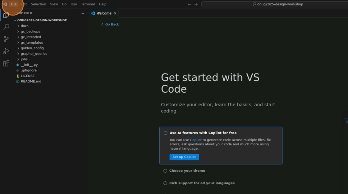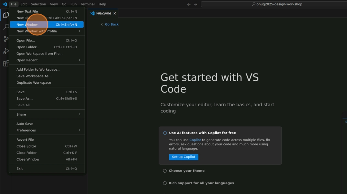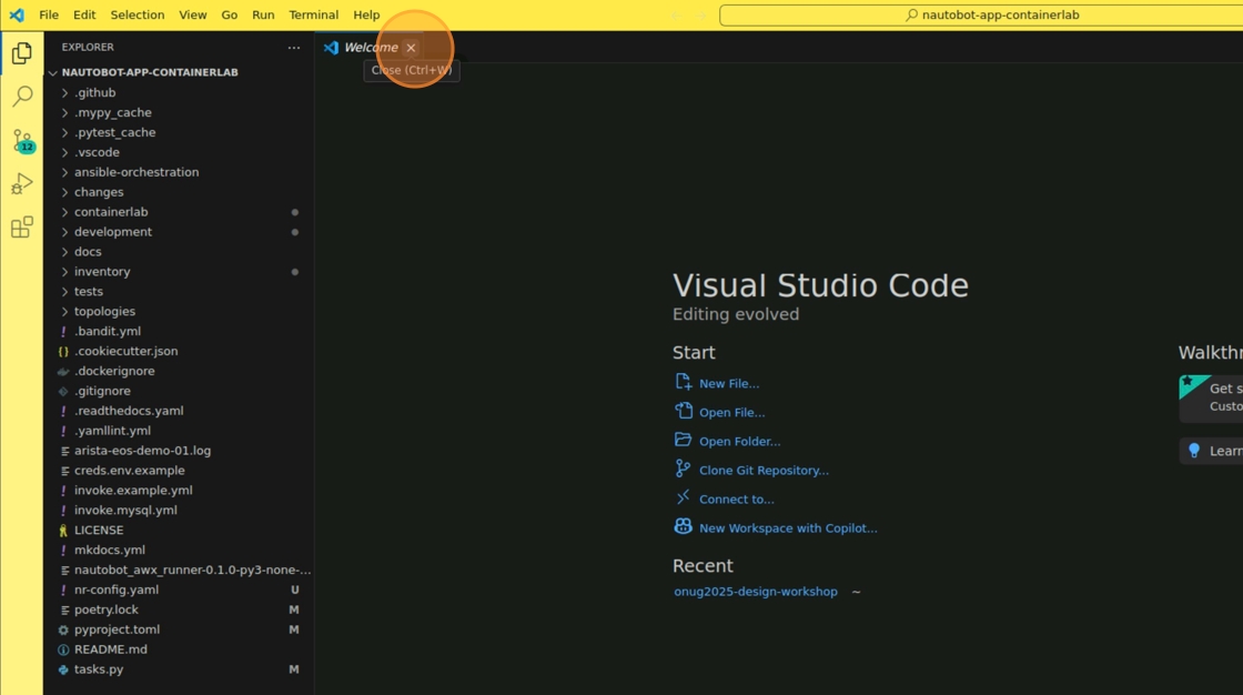 6. A Yellow border should appear around this VSCode window. This will help use distinguish the two windows throughout the lab. Close the Welcome tab.