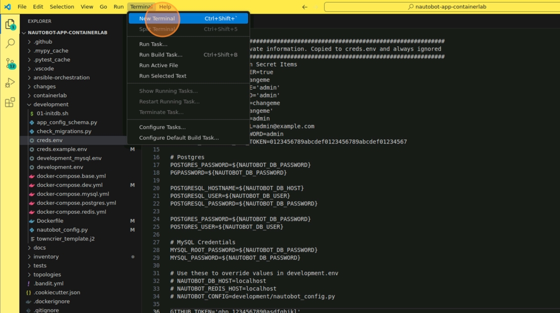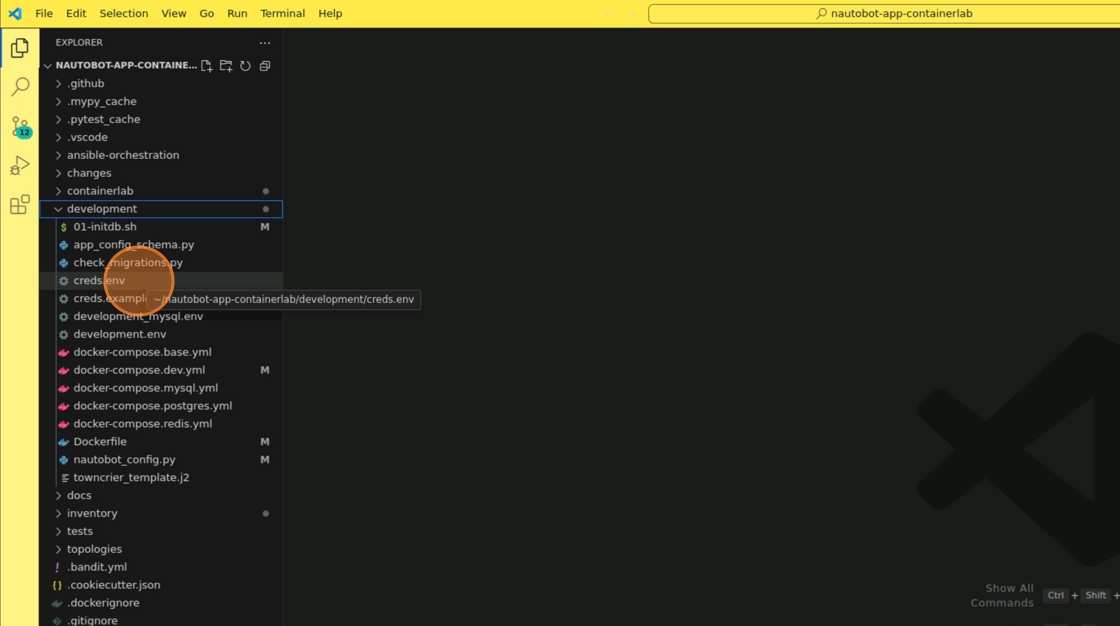 7. In the file explorer pane on the left side, expand the “development” folder and open the “creds.env” file