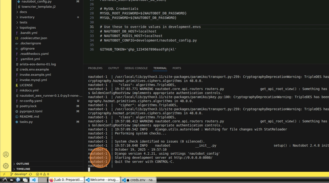 12.At this point, VSCode will automatically perform port forwarding and you should be able to see Nautobot by navigating to http://localhost:8080