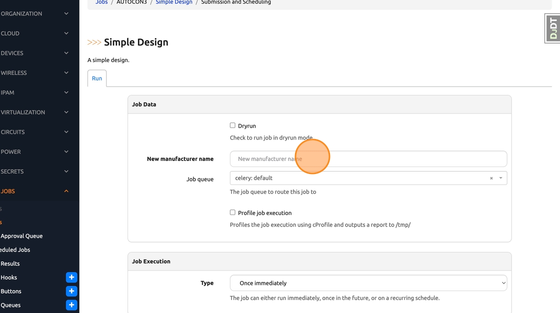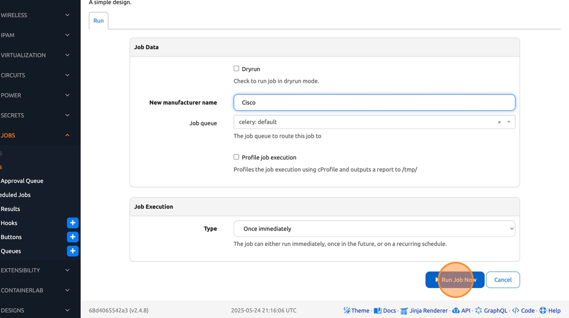 7. This is a very simple example design. It will only create a Manufacturer object in Nautobot using the user input from before.