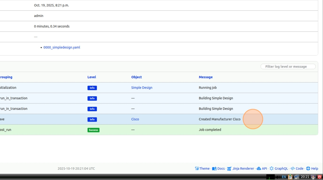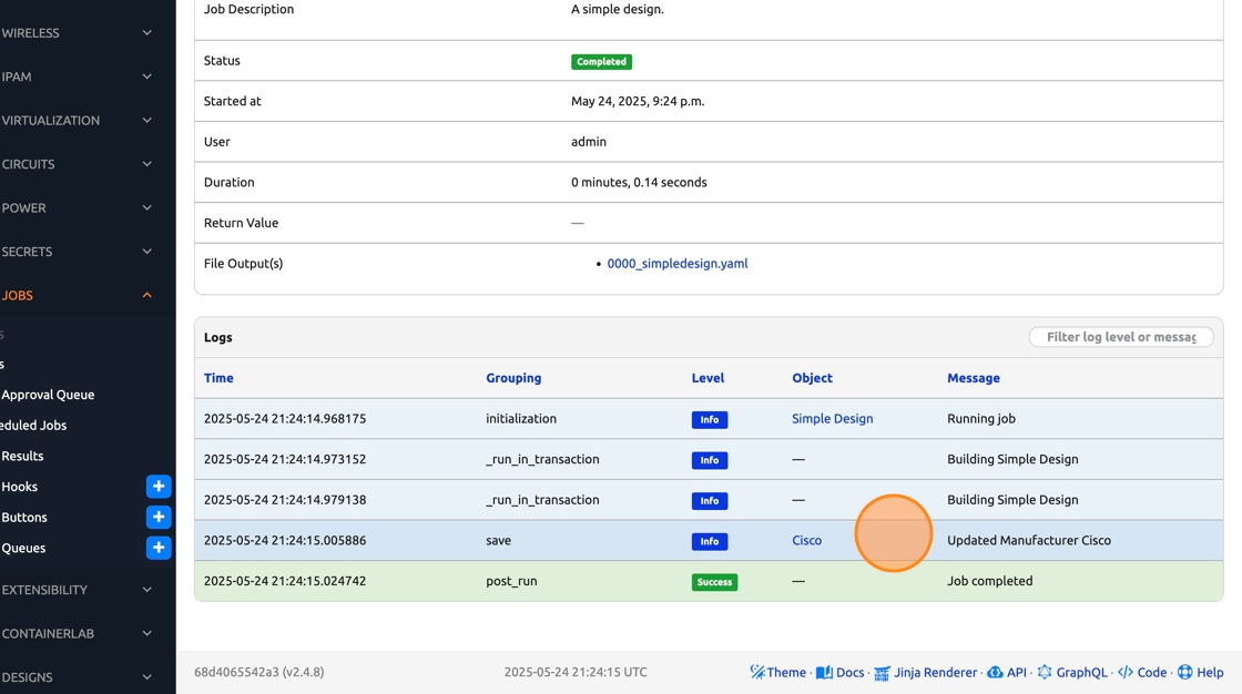 14. In the logs you can see that the manufacturer “Cisco” was created. What if we run the design again though?