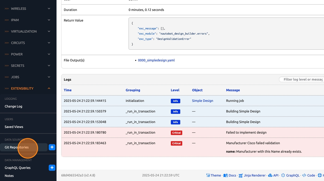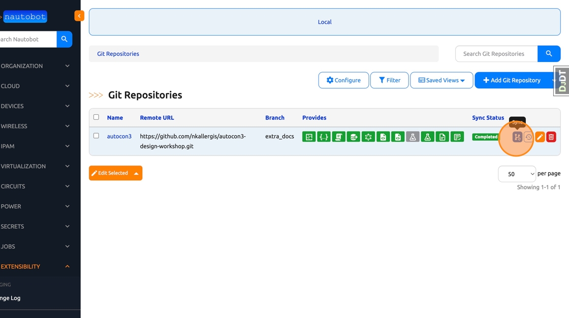 24. Navigate back to Nautobot in your browser, click “Extensibility -> Git Repositories”