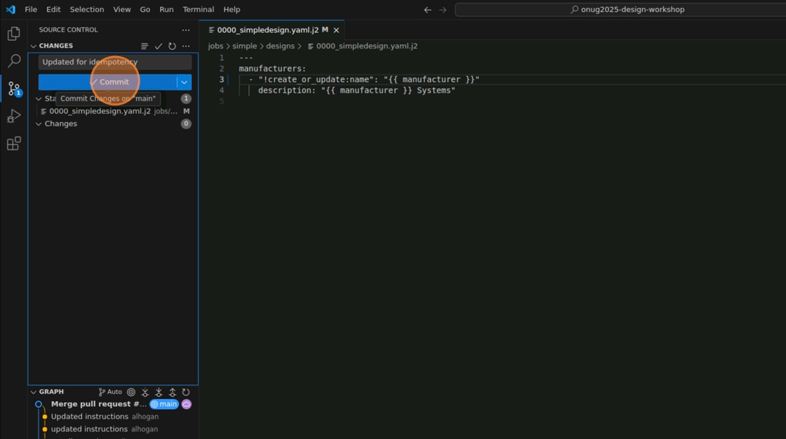 23. Type a commit message (ie Updated for idempotency) and then click on the “Commit” button