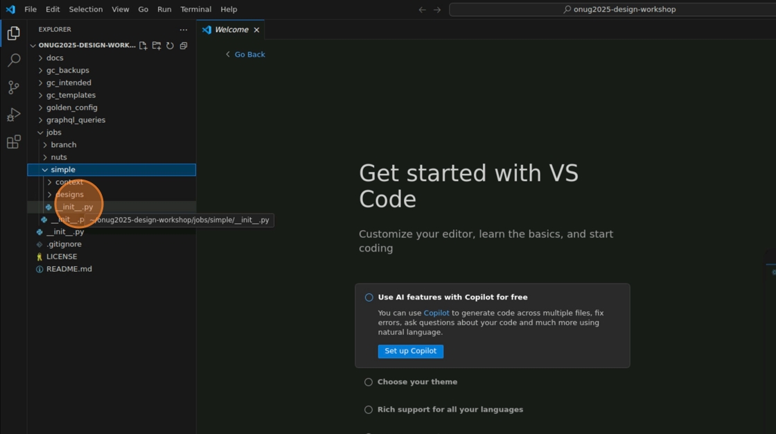 1. In the VSCode window with “onug2025-design-workshop” opened (the one without the yellow border), expand on the “jobs” folder