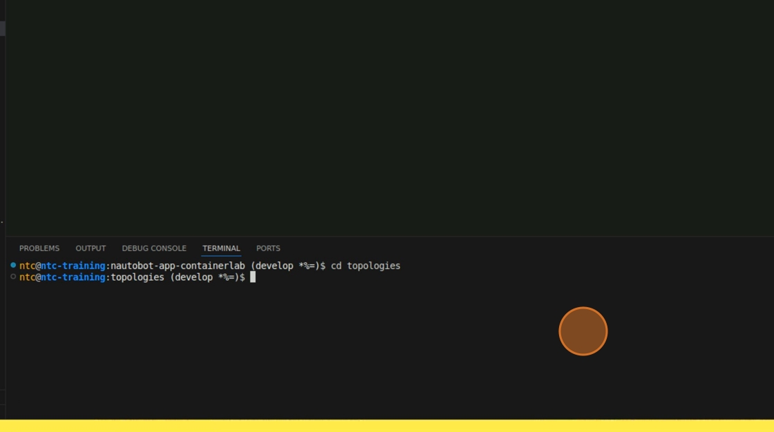 1. In the VSCode window with “nautobot-app-containerlab” opened (the one with the yellow border), right click “topologies” in the File Explorer pane