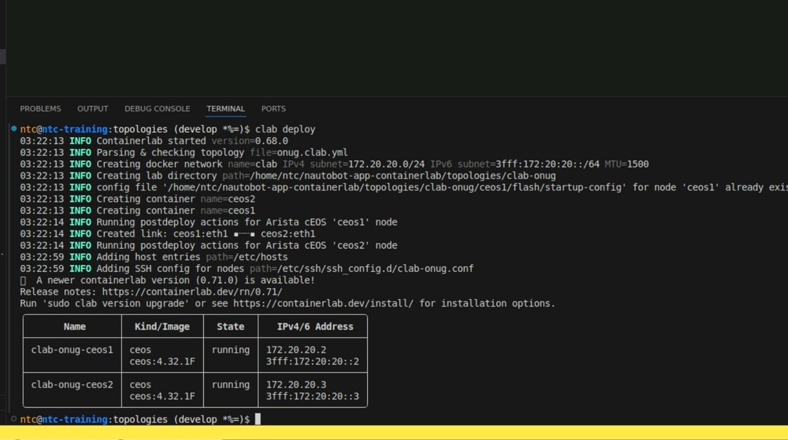 14. In your terminal, type clab deploy and press Enter. After a few seconds, the new lab will be up and running.