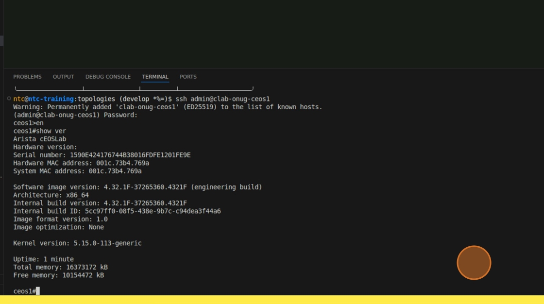8. You can see the details of our host are displayed in the table printed to the terminal. let’s SSH to the node, type ssh admin@clab-onug-ceos1 and press Enter. The default password is admin.
