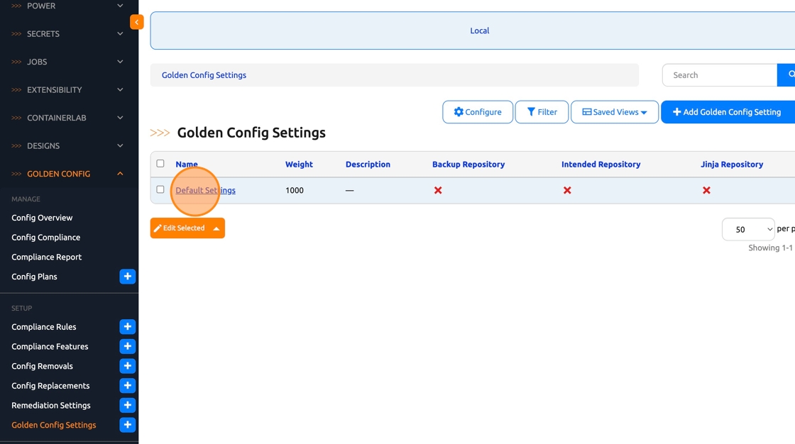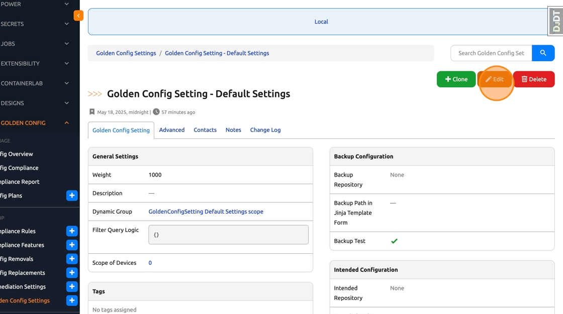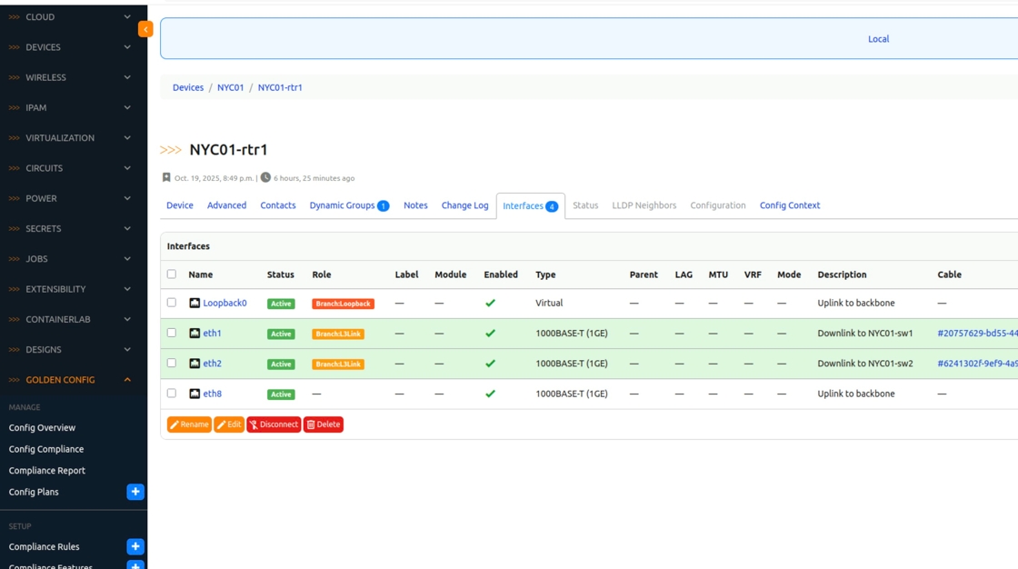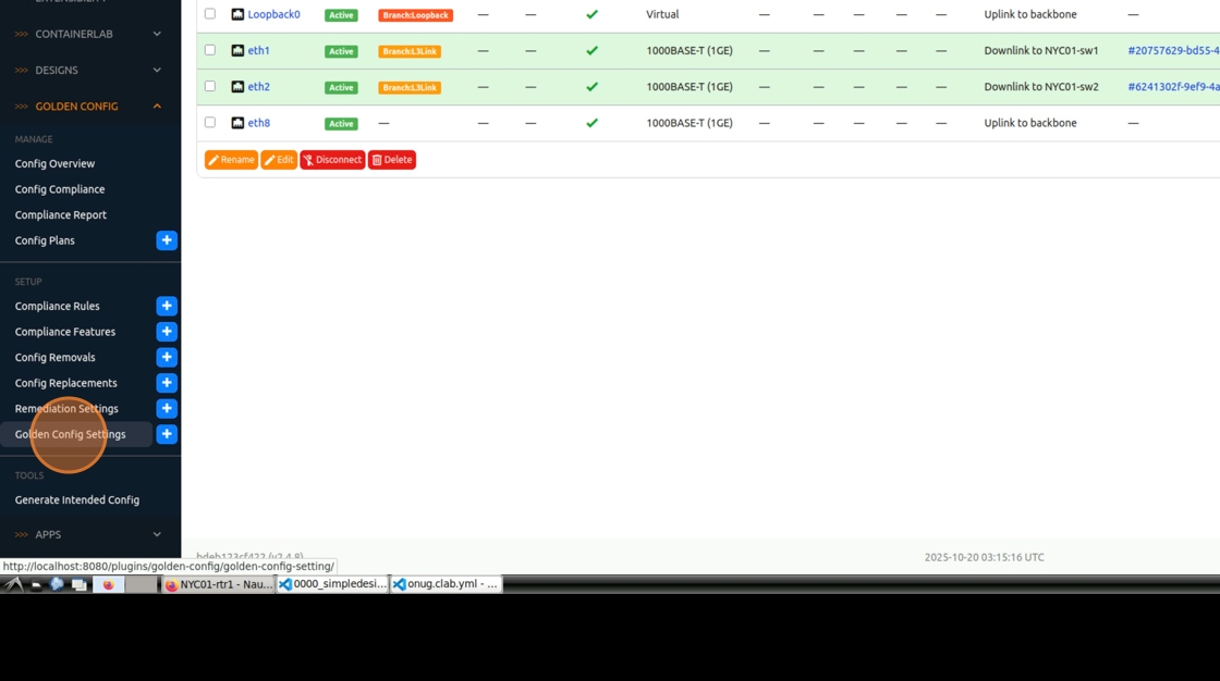 When we ran design builder in the first lab we also generated the intent data for the devices at our new site. Now we can use that intent data to generate our intended configurations and our ContainerLab topologies for testing. First, we need to setup our Golden Config settings and then we can render the intended configs.