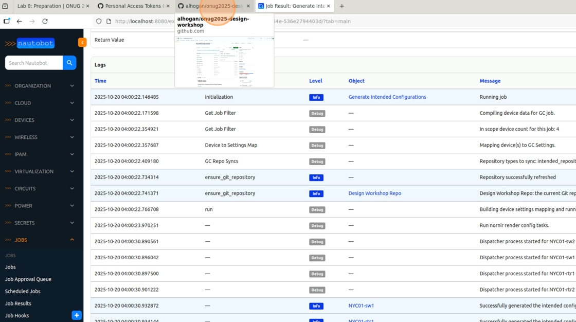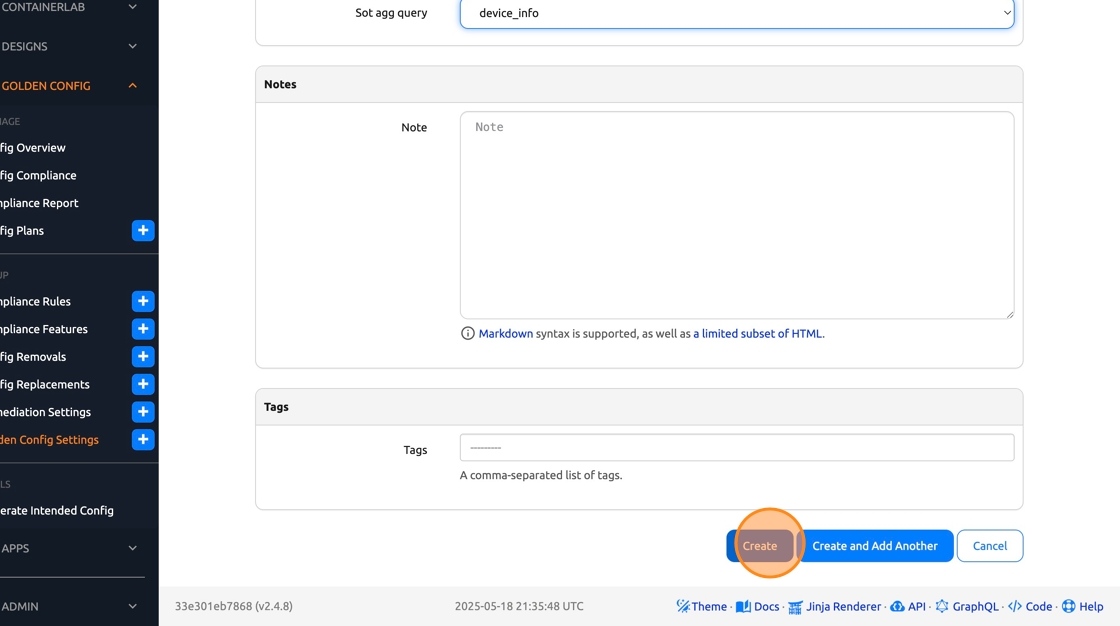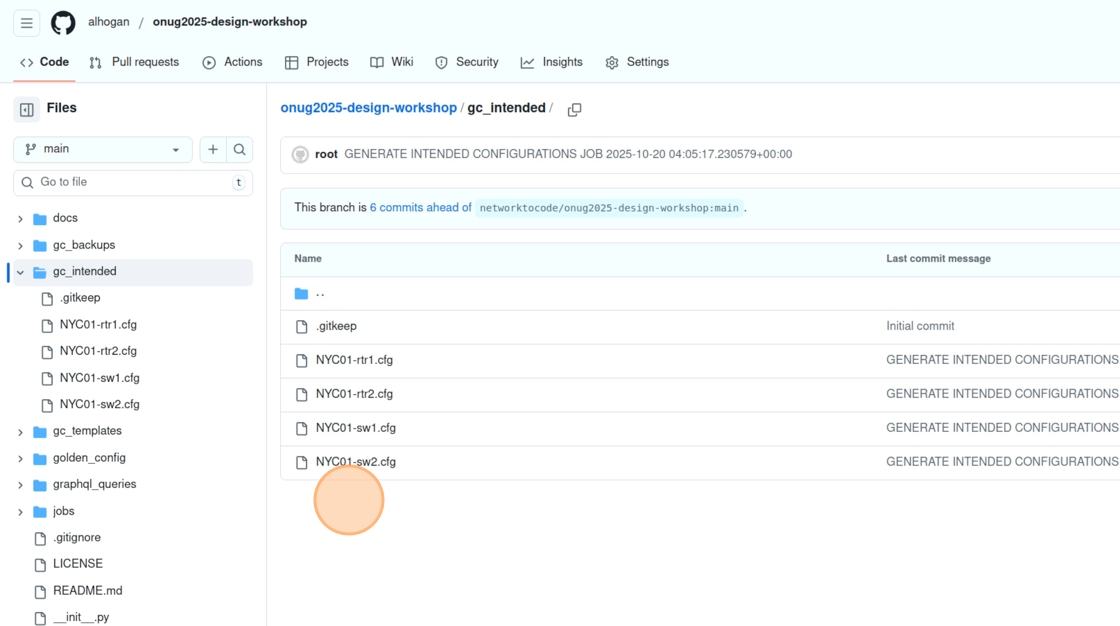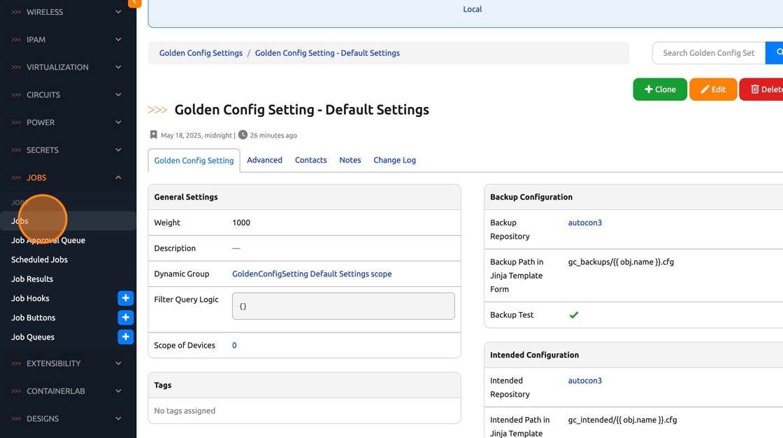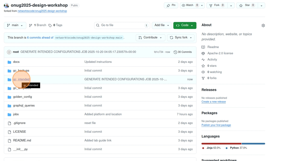 When we ran design builder in the first lab we also generated the intent data for the devices at our new site. Now we can use that intent data to generate our intended configurations and our ContainerLab topologies for testing. First, we need to setup our Golden Config settings and then we can render the intended configs.