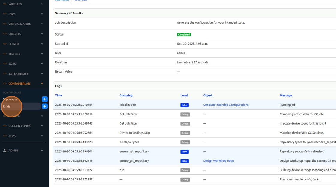 You have successfully used Nautobot to deploy a digital twin of a site in ContainerLab and bootstrapped the startup config from intended configs generated by Golden Config!