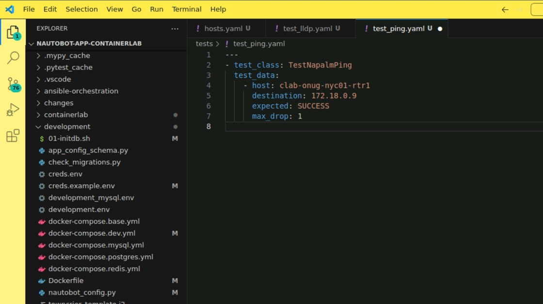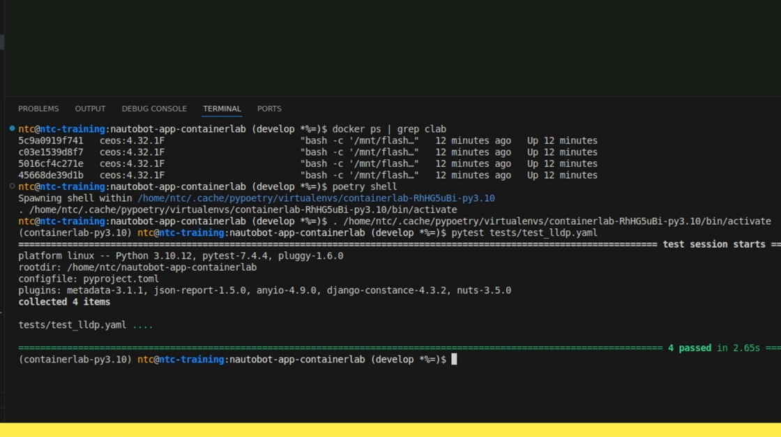 10. Type pytest tests/test_lldp.yaml to execute your test. If everything has gone according to the plan, you should see all of your LLDP tests passing