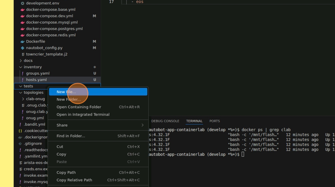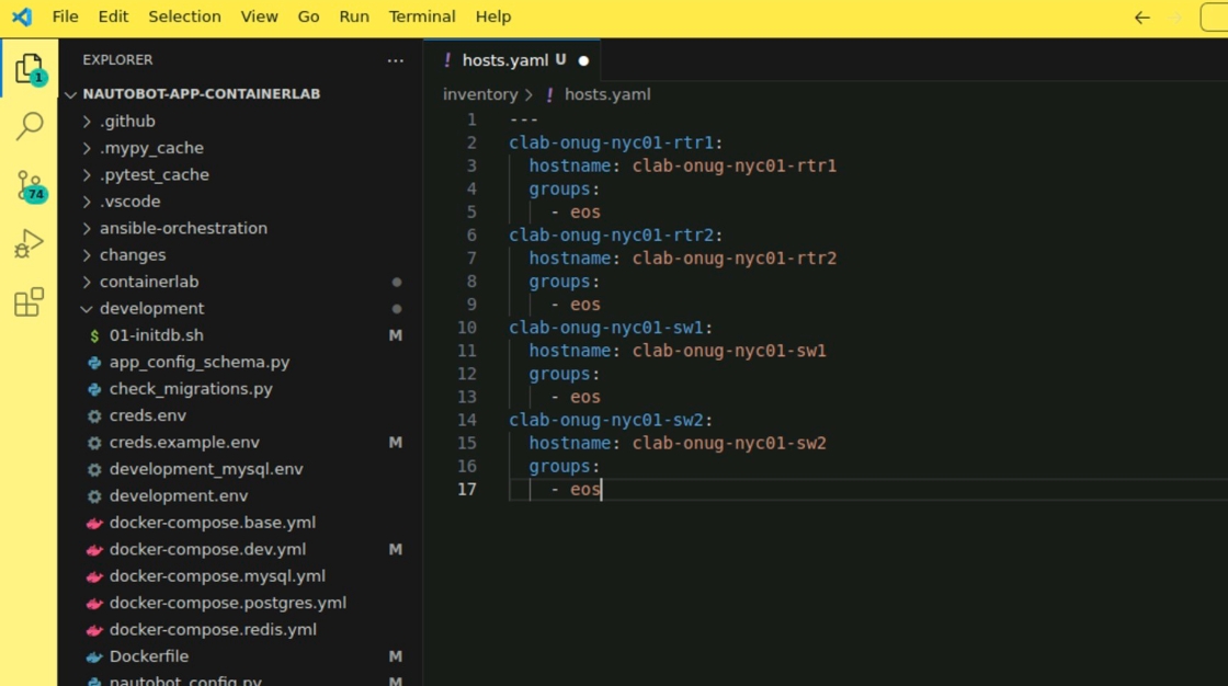 4. Right-click the “inventory” folder and Click “New File”. Name it hosts.yaml. Add our clab hosts to the file.