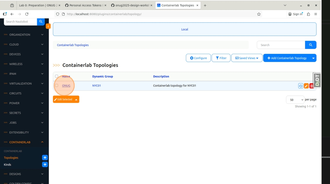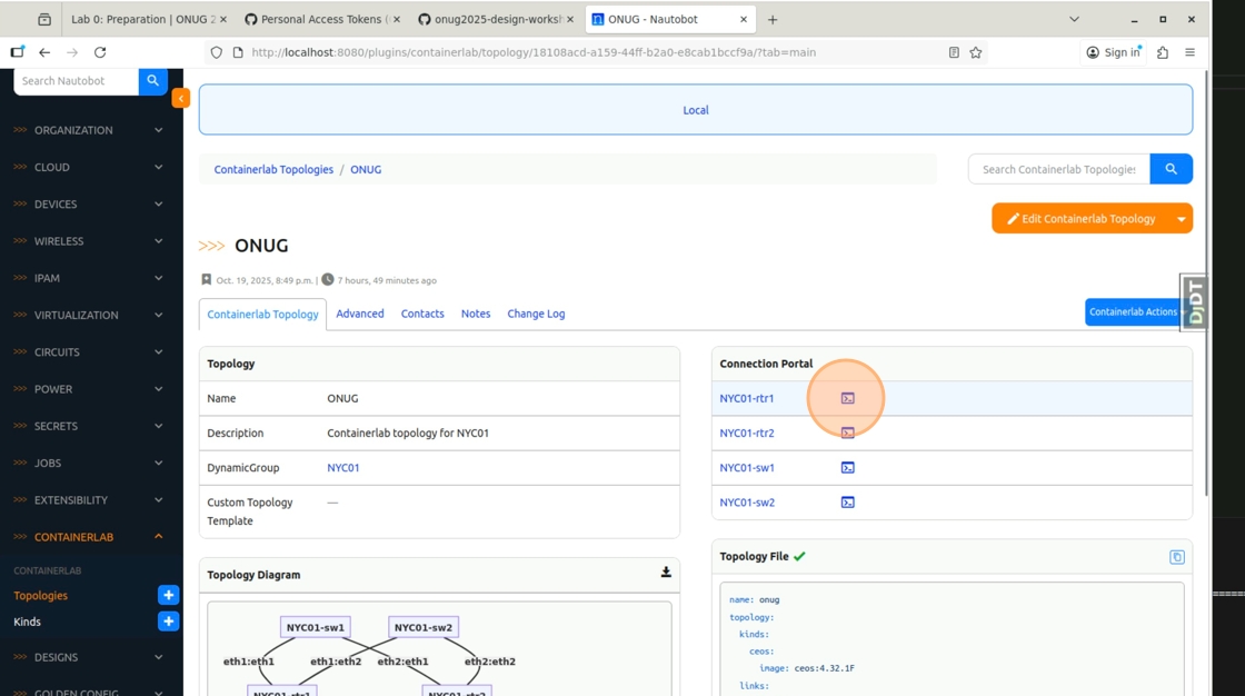 5. Select the containerlab topology created in previous steps (e.g. “ONUG”)