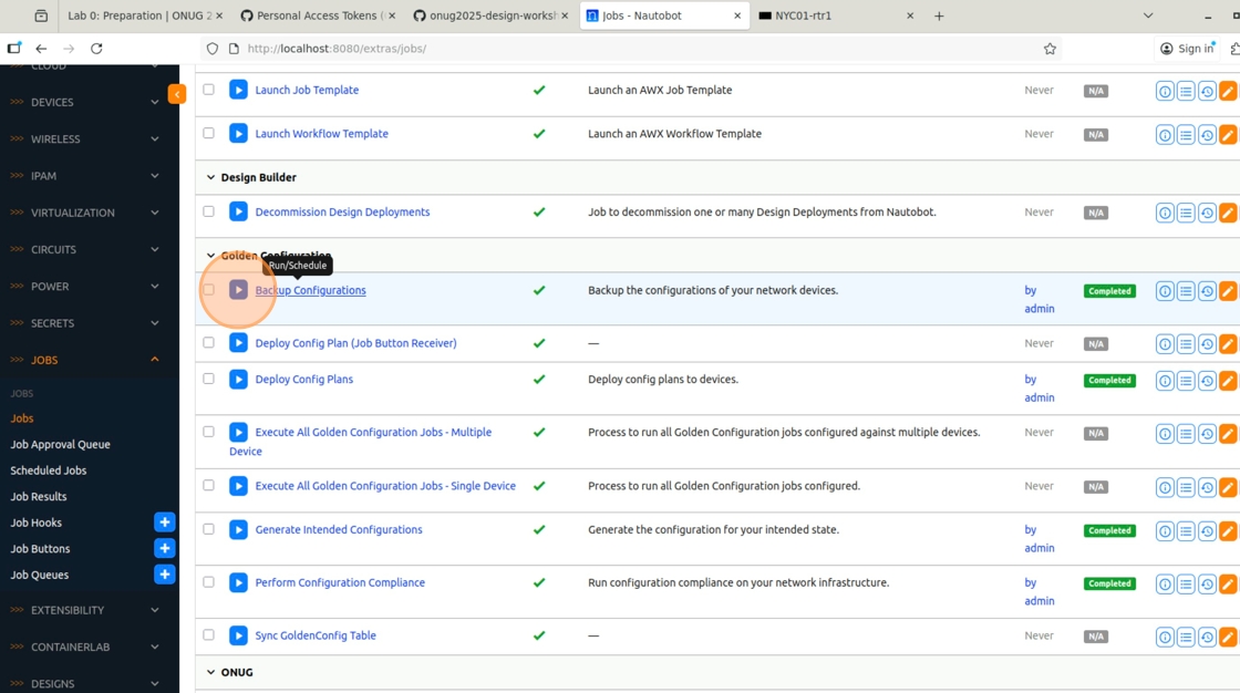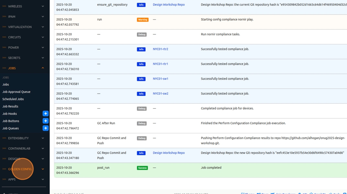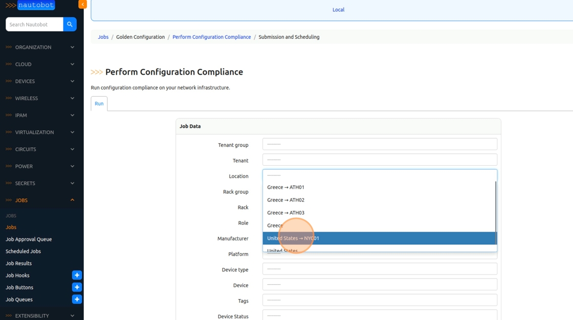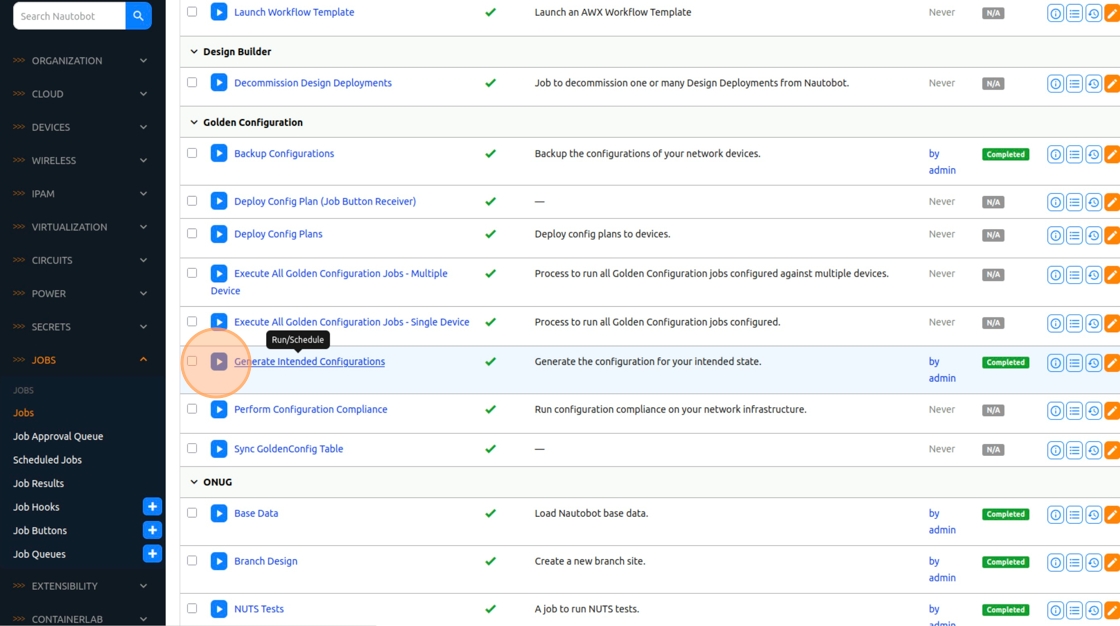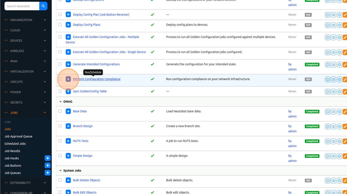 20. This time, we’ll be running the “Perform Configuration Compliance” Job. This Job will compare the running (backed up) and the intended configuration to see if they match or if they differ. Run the Job.