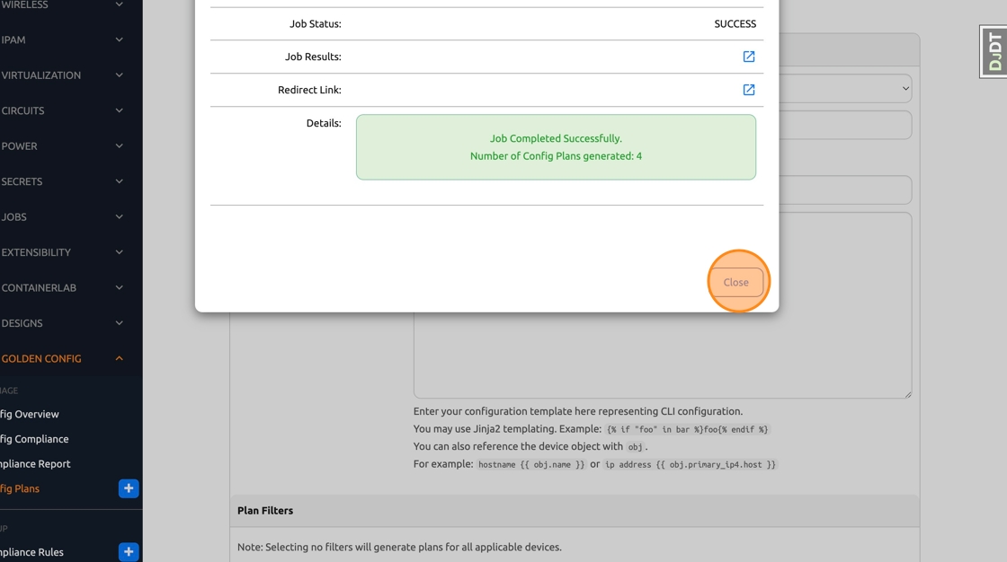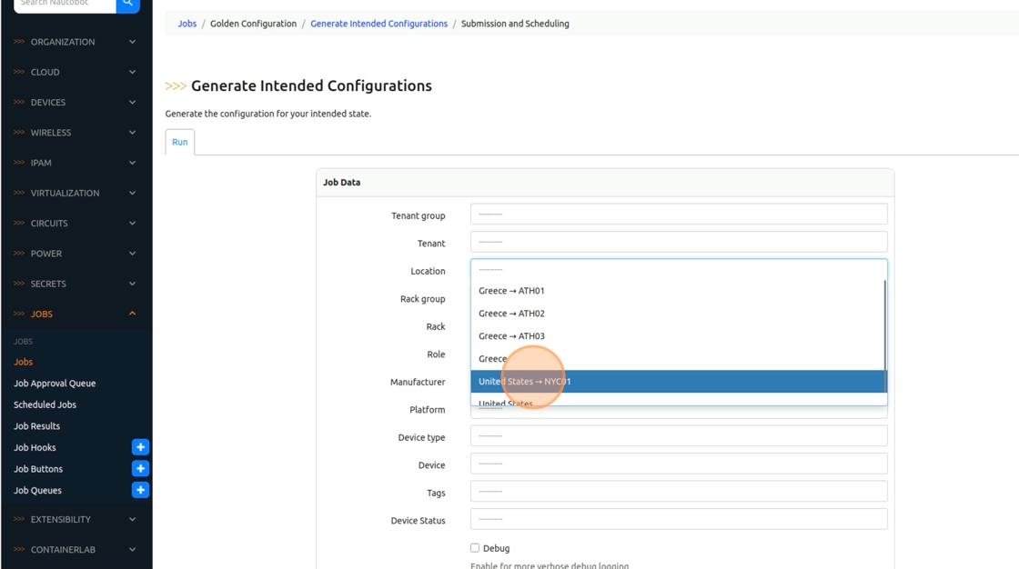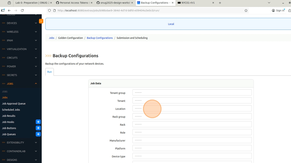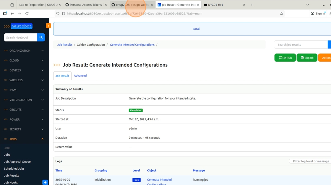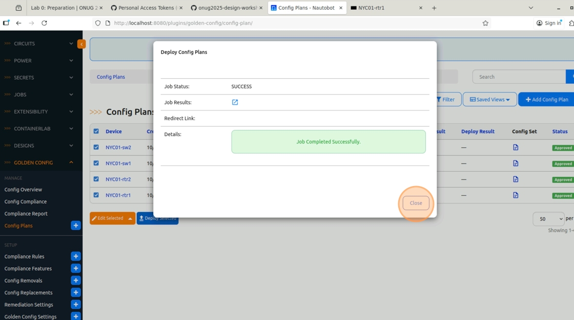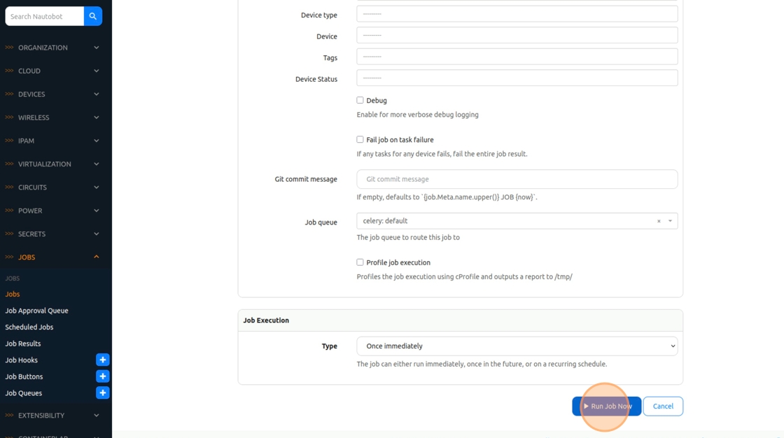 20. This time, we’ll be running the “Perform Configuration Compliance” Job. This Job will compare the running (backed up) and the intended configuration to see if they match or if they differ. Run the Job.