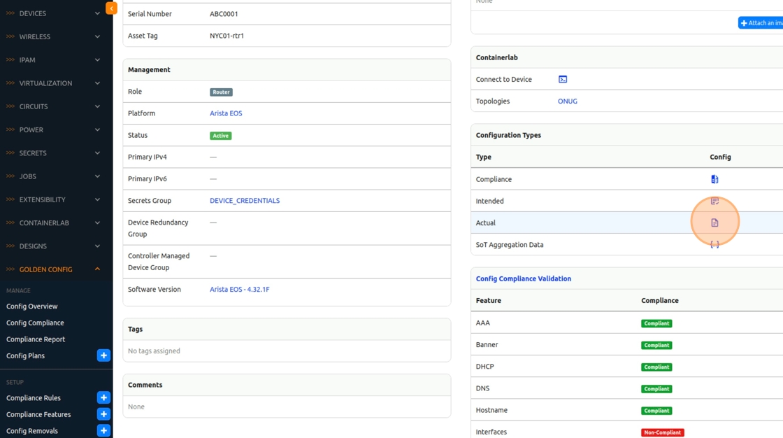 Note: You may ask “Why is Banner compliant if there is no configuration?”. Well the answer is that both the device and the intended configuration that was render did not have a banner configured. So technically we validated that the banner was not configured as intended.