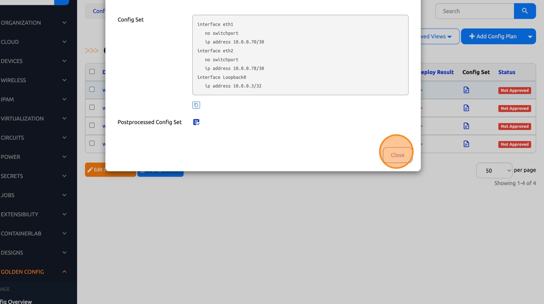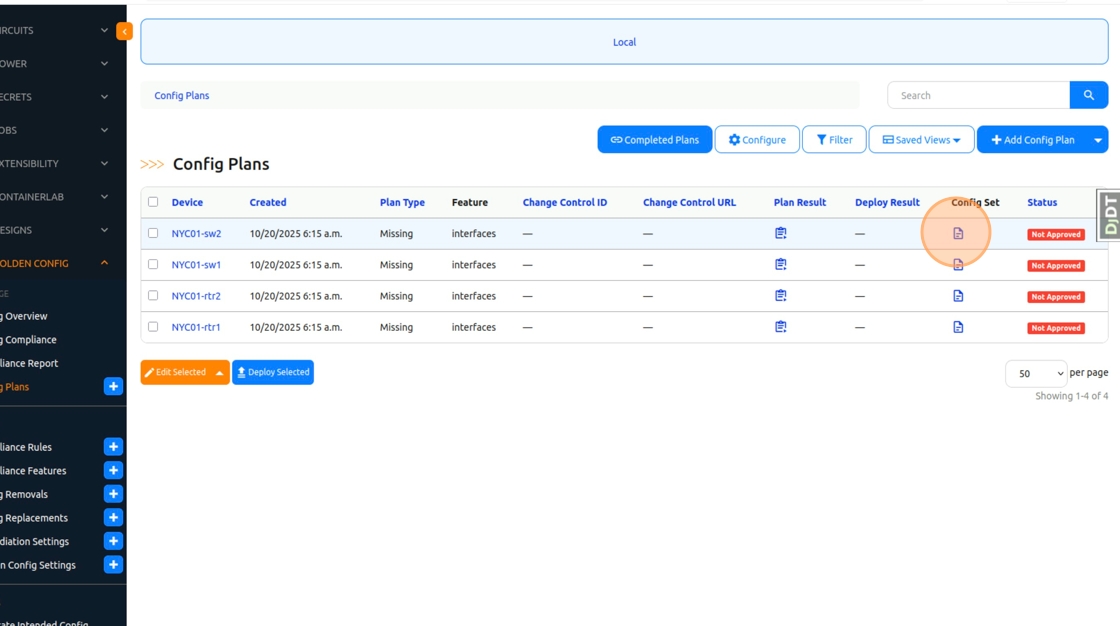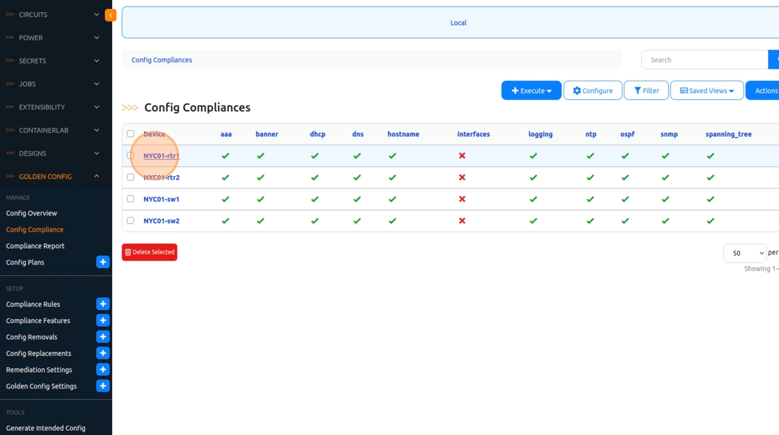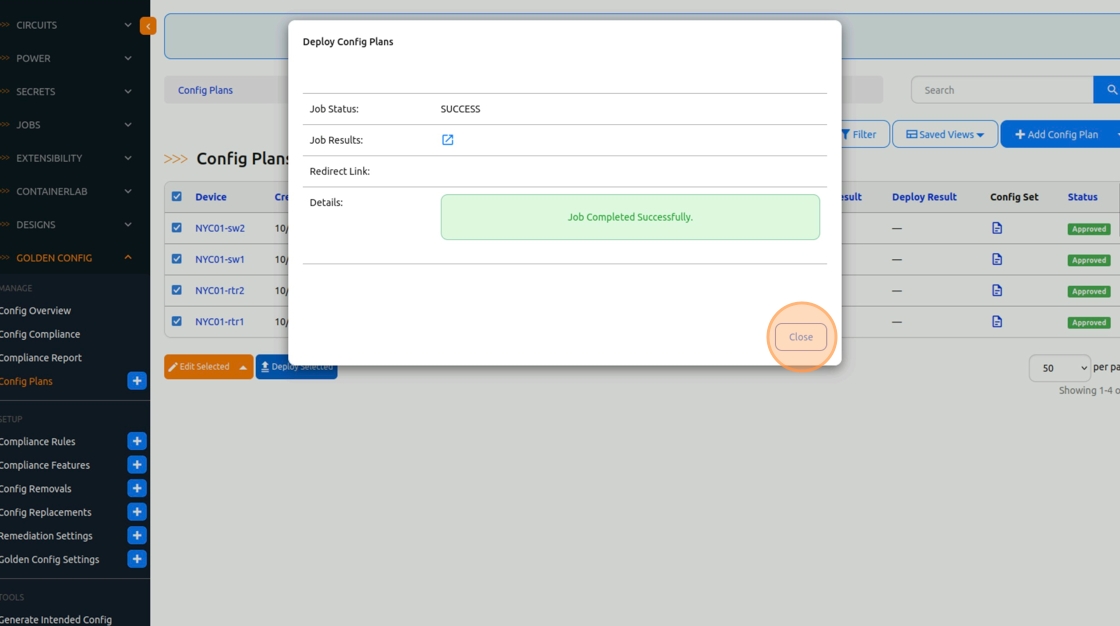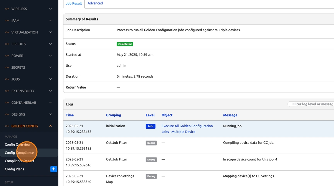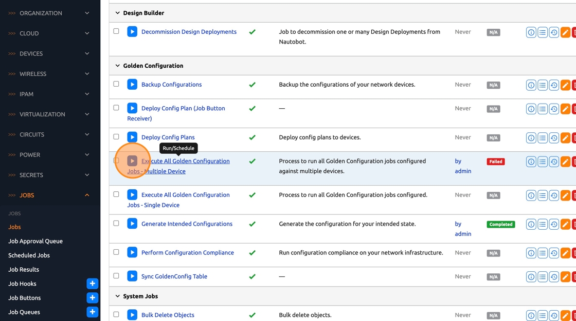 5. Run the “Execute All Golden Configuration Jobs - Multiple Device” Job. This will backup the configs, generate the intended configs, and perform configuration compliance.